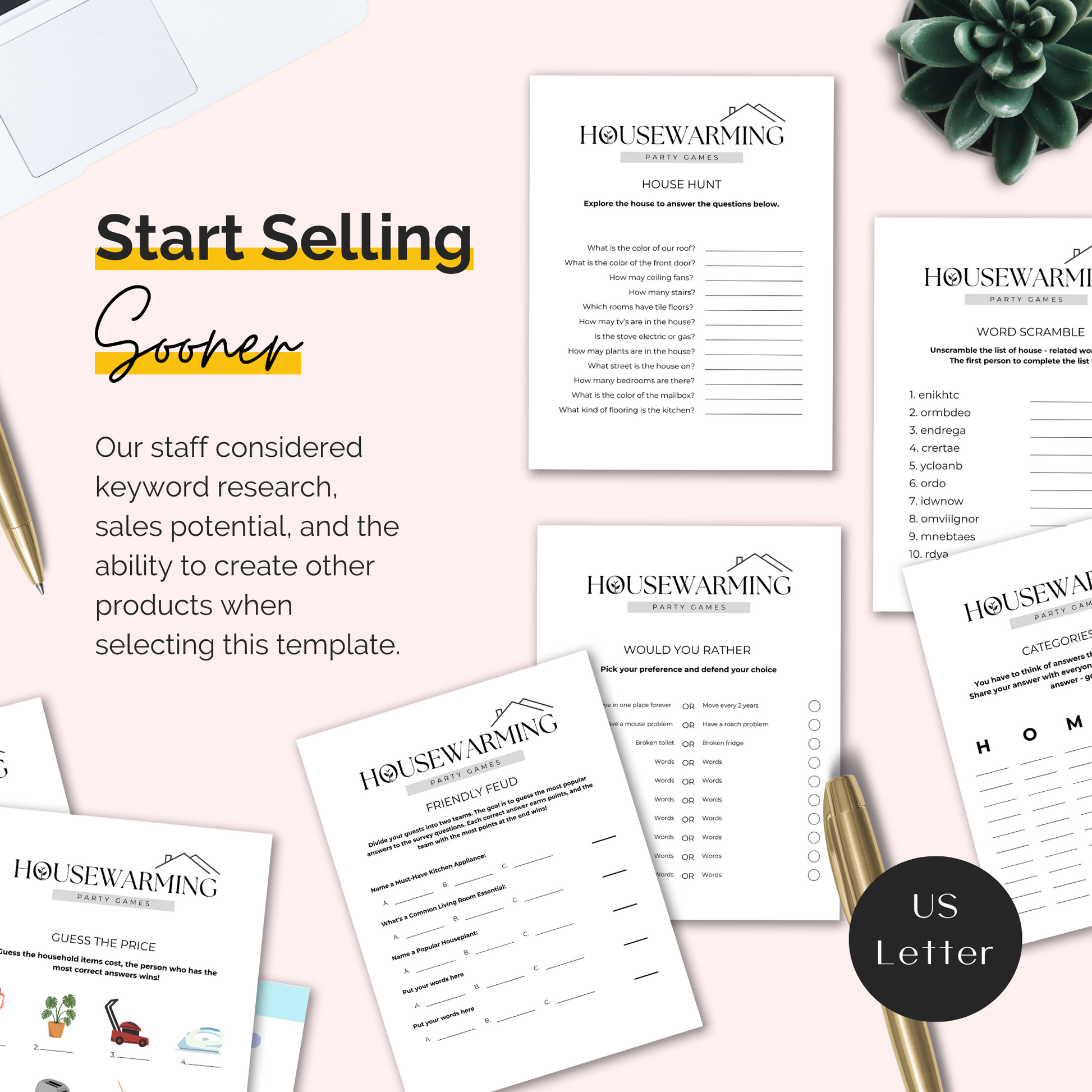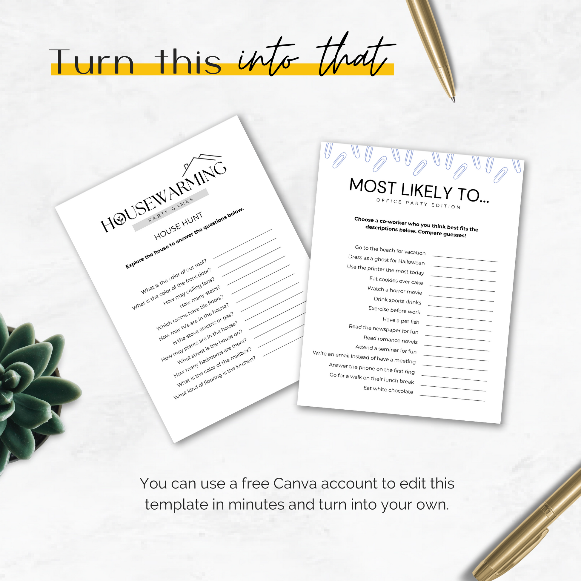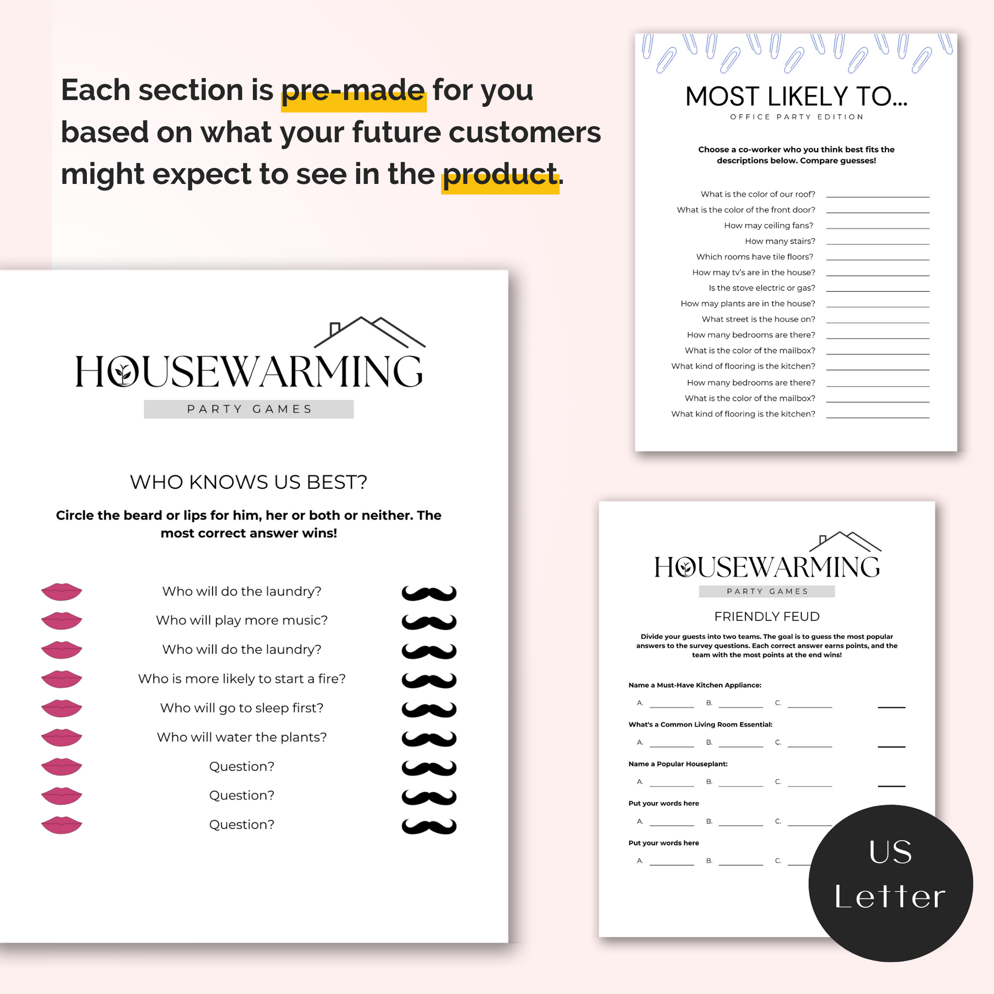 The Housewarming games bundle is in size US Letter and the mockups are in size 2500 x 2000 pixels. There are 13 game templates, 1 example of how to repurpose the templates, and 5 mockup templates.