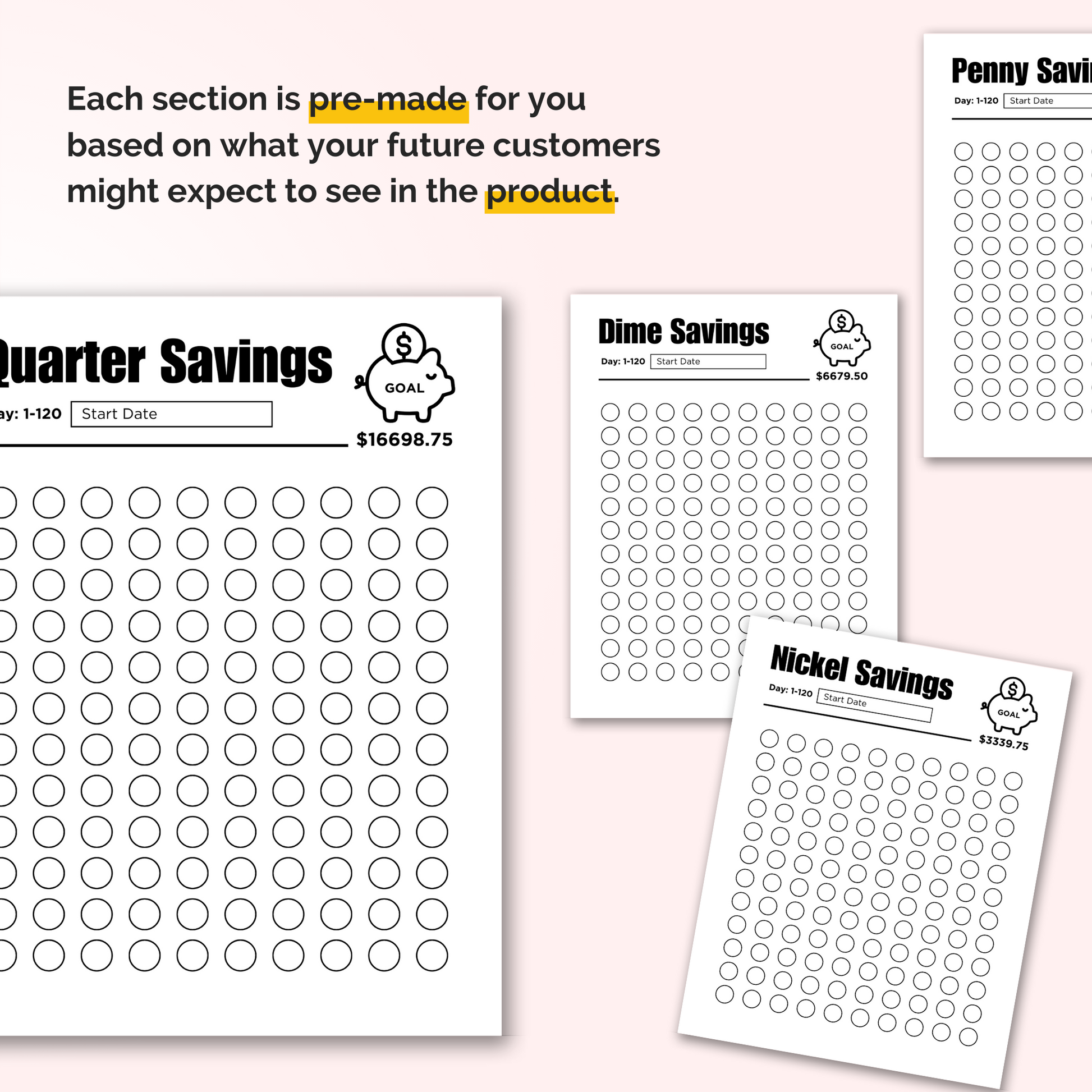 The Savings Tracker bundle is in size US Letter and the mockups are in size 2500 x 2000 pixels. There are 12 quarter, nickel, penny, dime savings trackers, 1 example of how to repurpose the templates, and 5 mockup templates.