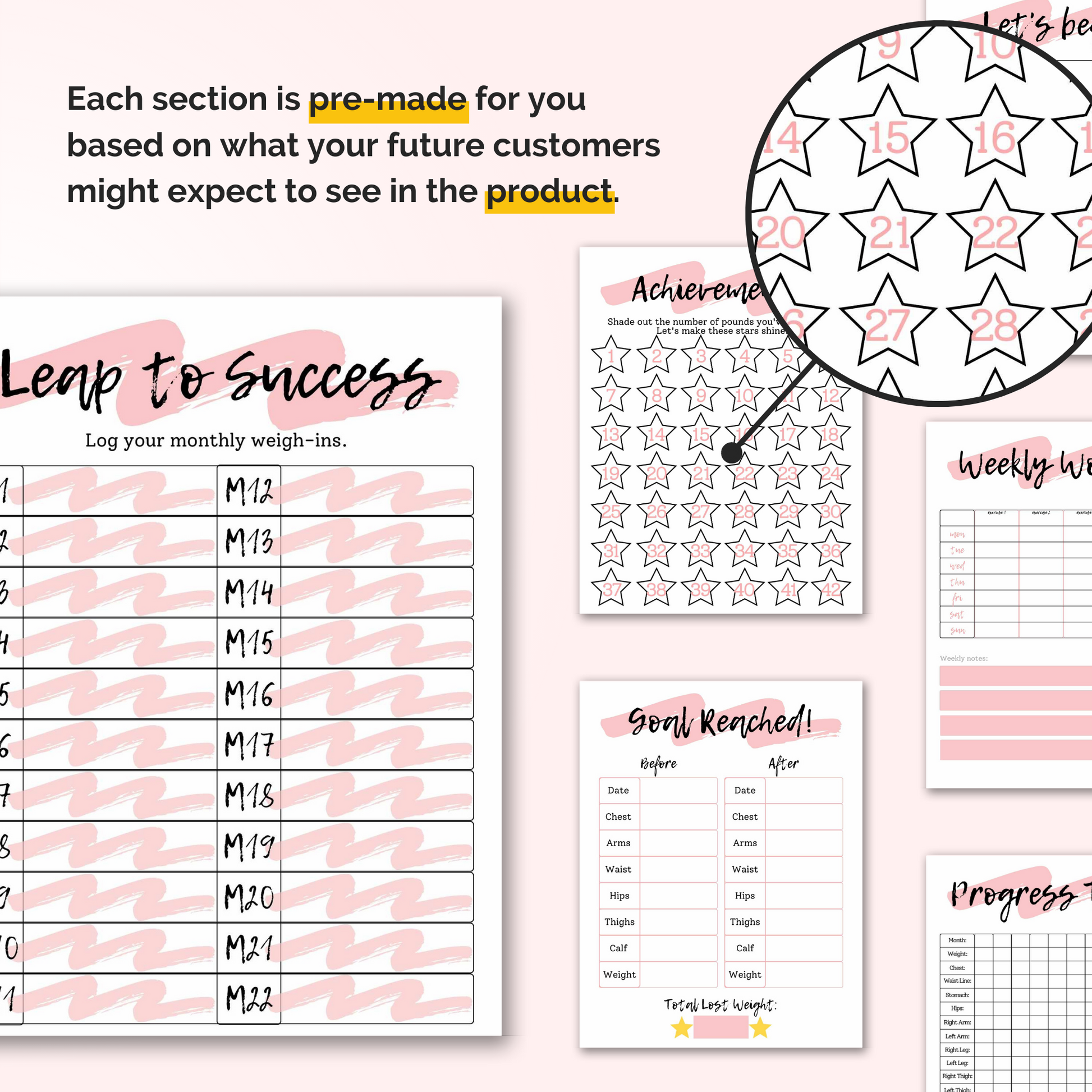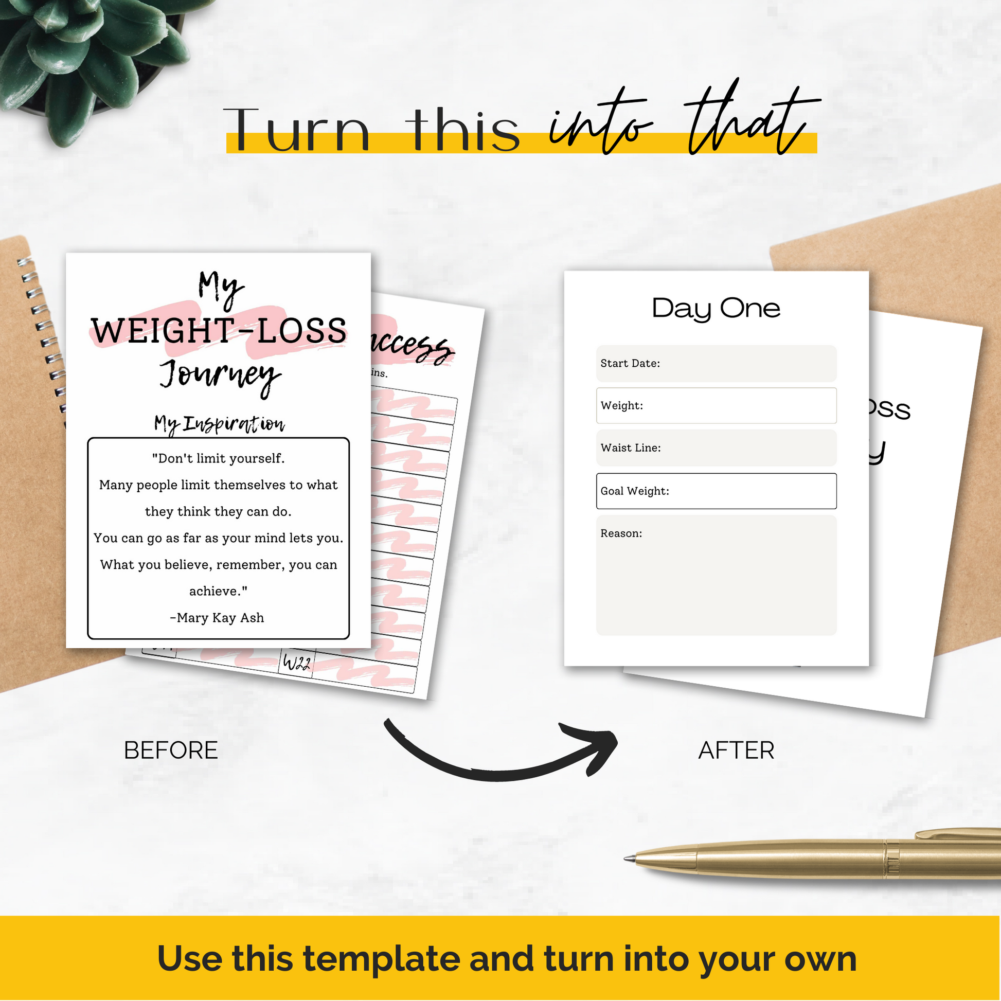 11-Page Weight Loss Tracker Template. Editable in Canva.
