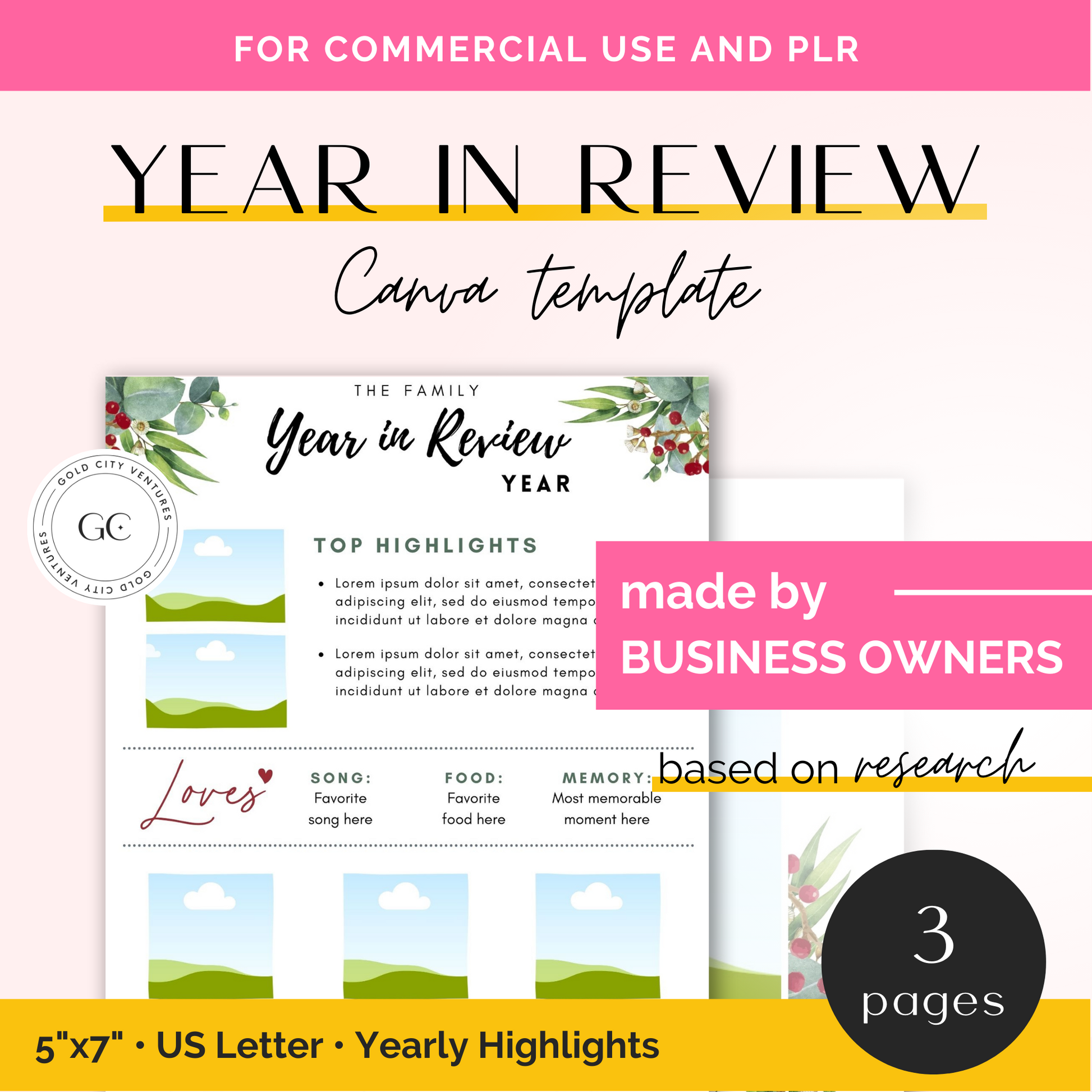 This 3 page Year in Review Newsletter template bundle will help you to easily create an in demand product for your e-commerce shop. Customize in Canva.