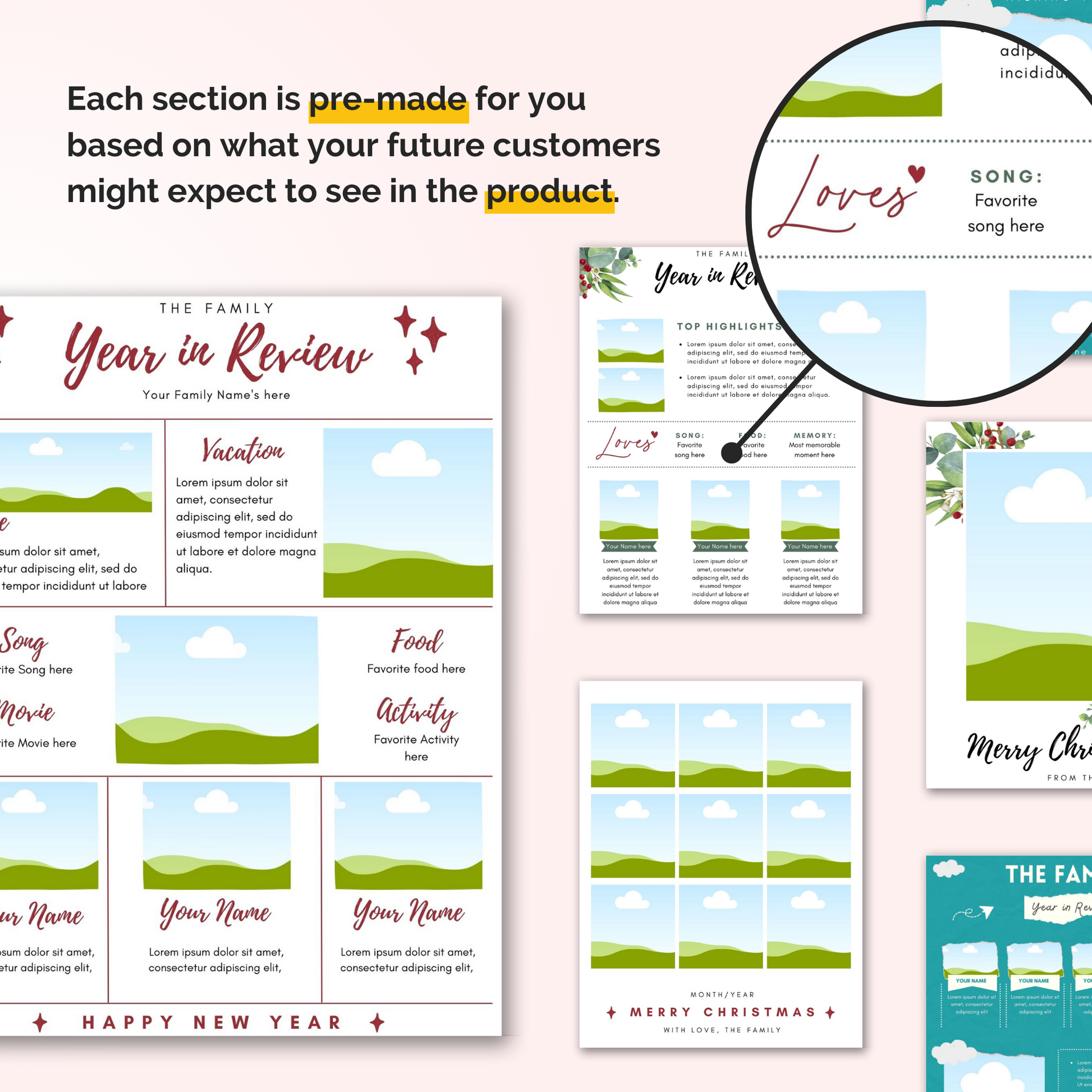 - 3 Year in Review Templates and 3 Holiday Cards in sizes 8.5"x11" (US Letter)